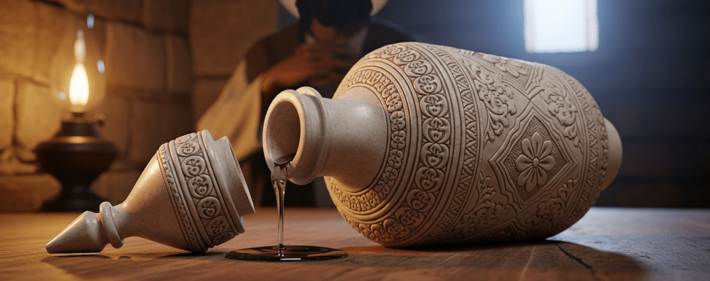 - The Alabaster Jar (resources beyond measure): Perhaps the most powerful example of this ‘divine wastefulness’ is the woman who anointed Jesus’s head with expensive perfume. The account in Matthew and Mark shows the immediate reaction of the disciples/some who were present: indignation. “Why this waste?” they asked. “This perfume could have been sold for more than a year’s wages and the money given to the poor.” (v.4-5) The disciples saw a resource allocation problem. Jesus saw pure love. He defended her, saying, “She has done a beautiful thing to me.” (v.6). This alabaster jar—a precious, irreplaceable resource—was poured out entirely, its fragrance filling the house. It was not a measured dab; it was an unrestrained flow. It was ‘wasted’ on Him, and in doing so, it became eternally preserved in His story. What is your alabaster jar? Is it your talent, your savings, your expertise, or your home? Whatever it is, the invitation is to pour it all out, not for efficiency, but for adoration.